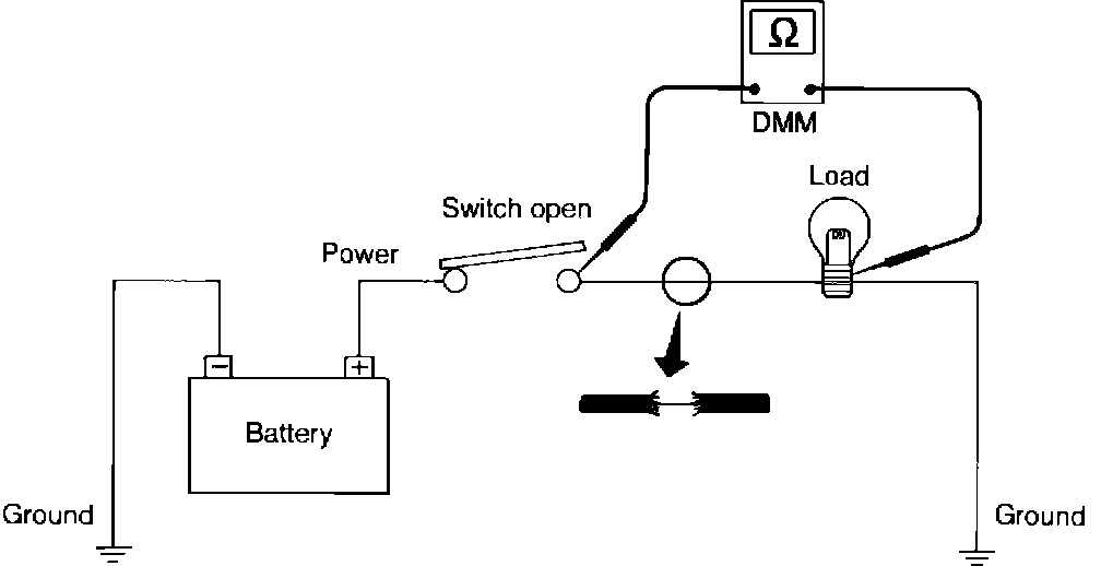To help in understanding the diagnosis of open circuits please refer to the previous diagram. In any powered circuit, an open can be found by methodically checking the system for the presence of voltage. This is done by switching the DMM to the voltage function.