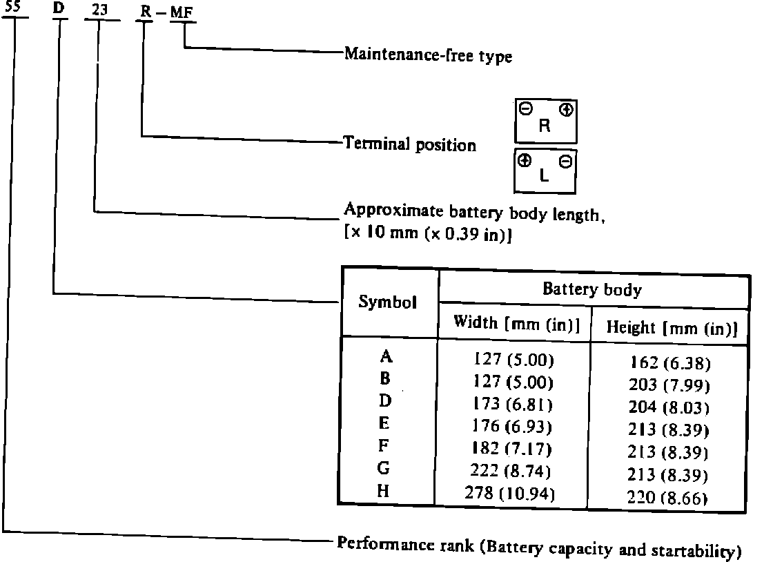 Battery designations for Nissan models have been changed. However, the performance and size of the batteries remain the same. For your reference, an explanation of battery designations is shown below, and a cross reference chart of old and new designations is found on page EE-20.