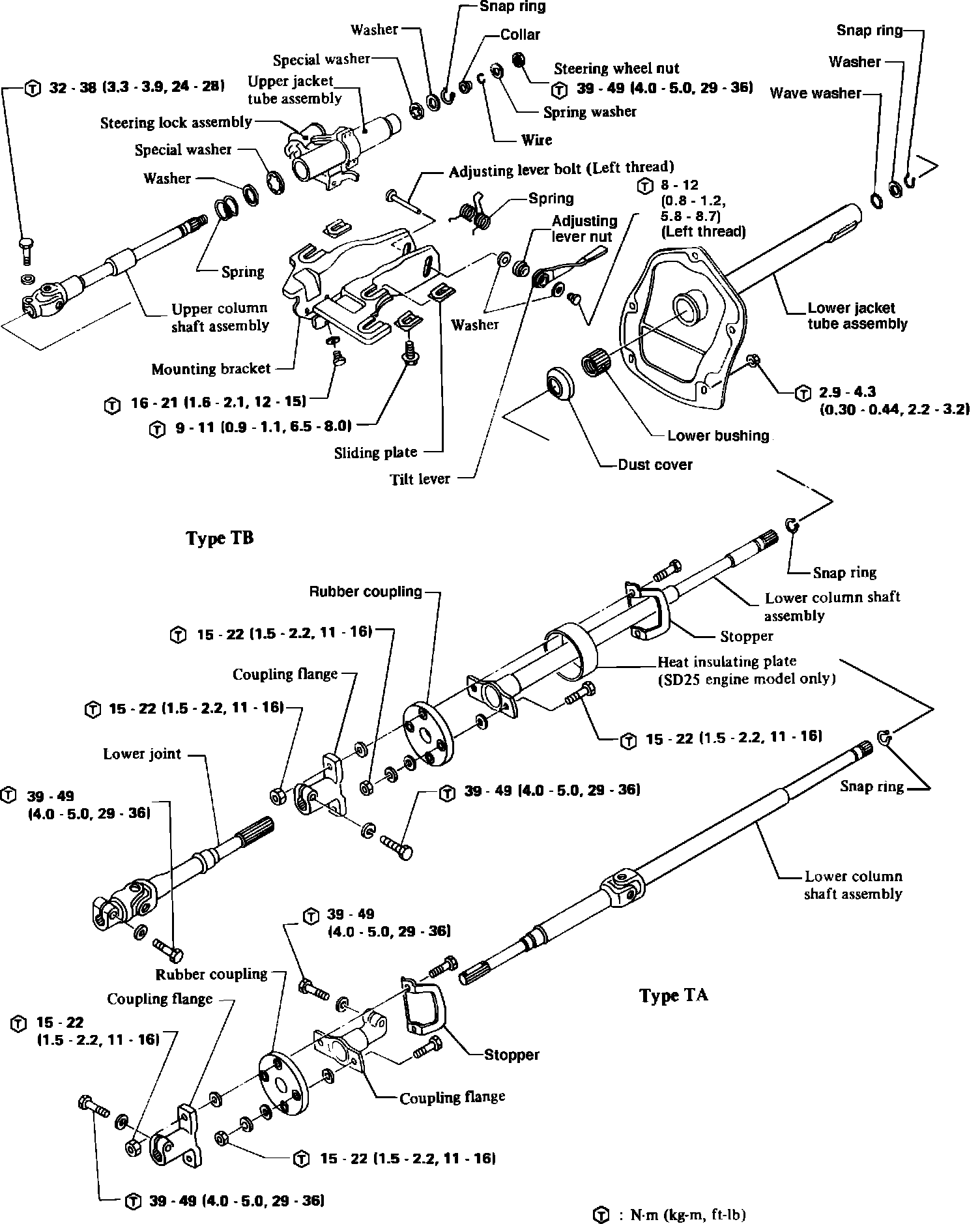 Fig. 7 Exploded view of steering column. 1982-86 Pickup w/tilt column: