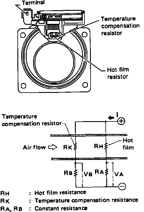 As heat is dissipated by the wire an electrical signal is sent to the ECM. As the temperature of the wire decreases, so does it's resistence. The control circuit regulates current I in relation to the varying resistance value RH so that VA always equals VB. The ECM receives the voltage value from VA and converts it into an air flow rate.