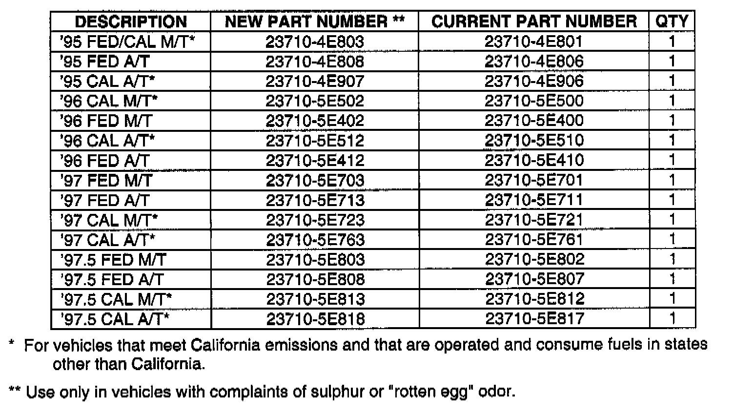 These ECMs are for use only in vehicles with customer complaints of sulphur or "rotten egg" odor. All other ECM replacements, for whatever reason, require use of the "current" part number. Do not replace the catalytic converter for this complaint.