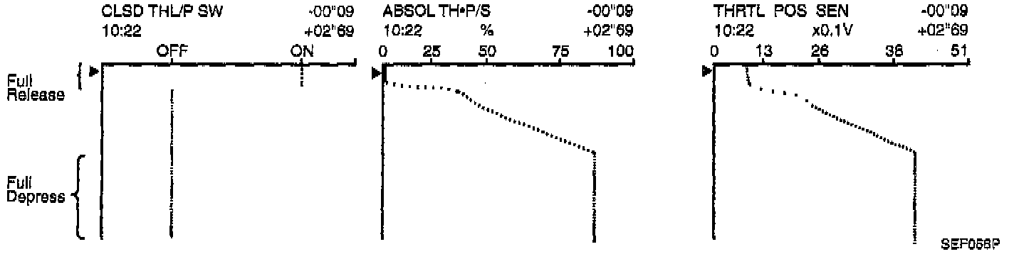 The data for "THRTL POS SEN", "ABSOL TH-P/S" and "CLSD THL/P SW" when depressing the accelerator pedal with the ignition switch "ON".