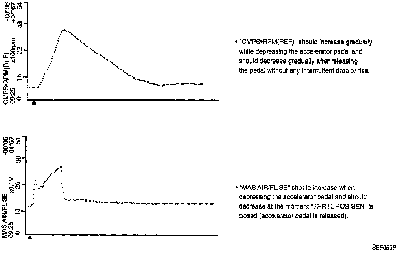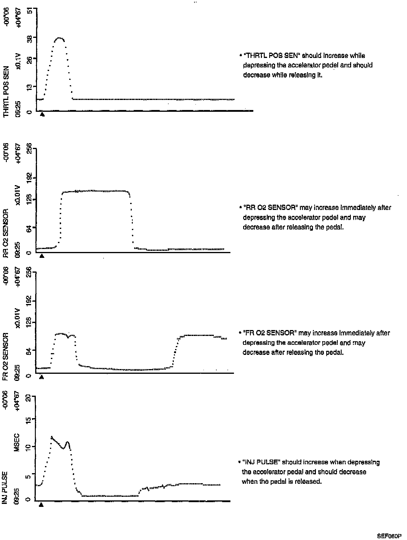 The data for "CMPS-RPM (REF)", "MAS AIR/FL SE", "THRTL POS SEN", "RR O2 SENSOR", "FR O2 SENSOR" and "INJ PULSE" when racing quickly up to 4,800 rpm under no load after warming up engine sufficiently.