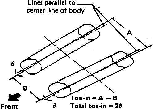 The leading edge of each wheel should toe-in or toe-out slightly in relation to the vehicle centerline to ensure proper vehicle tracking. Toe should be inspected using suitable alignment gauges, following manufacturer's instructions.