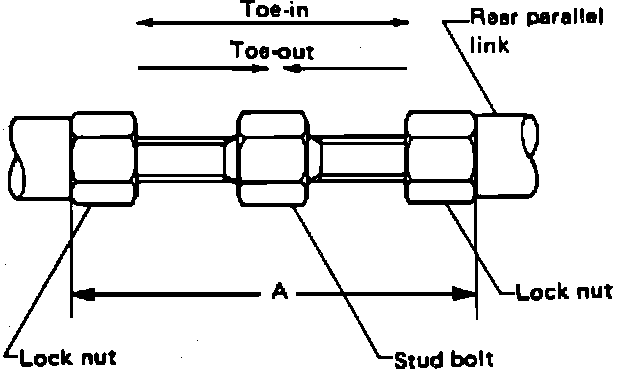 Rear toe-in is adjusted by varying the length of the rear parallel links, Fig. 4.