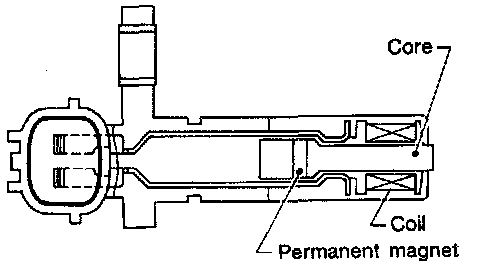 The crankshaft position sensor (OBD) is located on the transaxle housing facing the gear teeth (cogs) of the flywheel or drive plate. It detects the fluctuation of the engine revolution. The sensor consists of a permanent magnet, core and coil. When the engine is running, the high and low parts of the teeth cause the gap with the sensor to change.