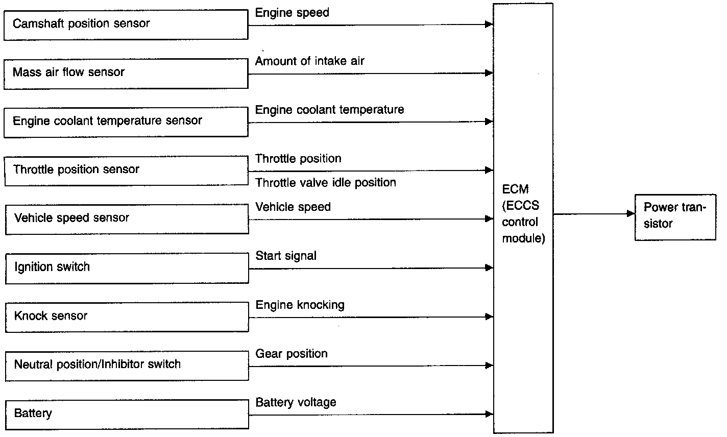 The ECM detects information such as the injection pulse width and camshaft position sensor signal. Responding to this information, ignition signals are transmitted to the power transistor.