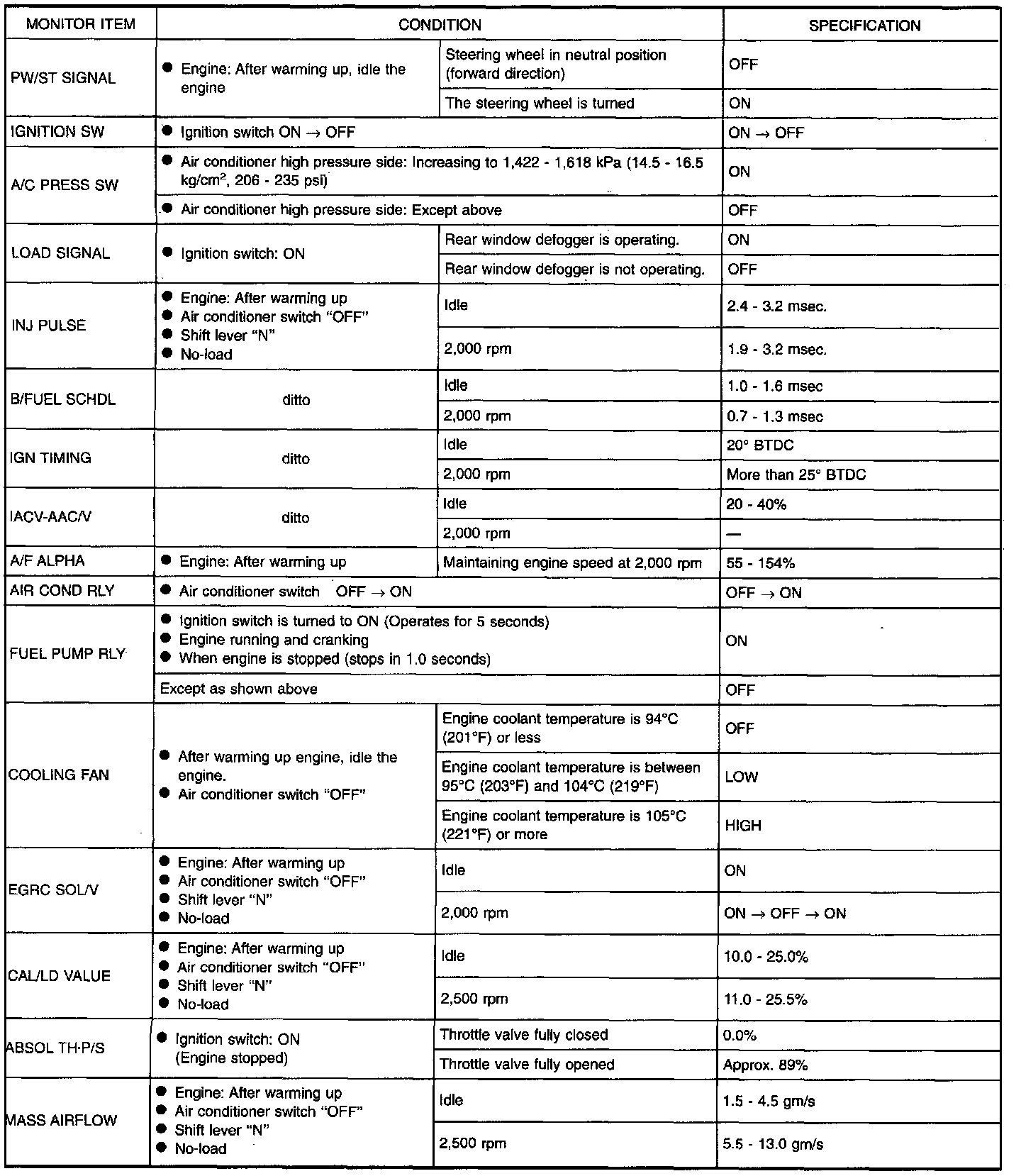 i.e. Adjust ignition timing with a timing light before monitoring IGN TIMING, because the monitor may show the specification data in spite of the ignition timing not being adjusted to the specification data. This IGN TIMING monitors the data calculated by the ECM according to the signals input from the camshaft position sensor and other ignition timing related sensors.