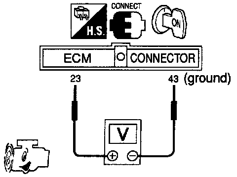 4. Check the voltage between ECM terminal (23) and (43) (ground) and check the following: