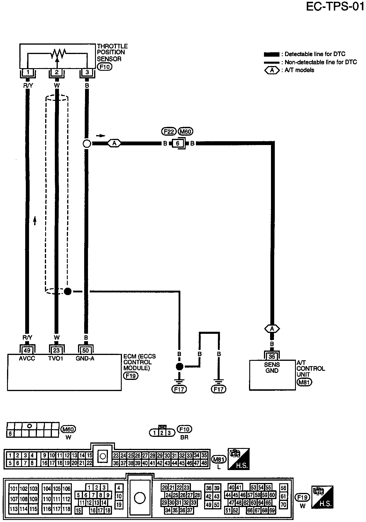 The throttle position sensor responds to the accelerator pedal movement. This sensor is a kind of potentiometer which transforms the throttle position into output voltage, and emits the voltage signal to the ECM. In addition, the sensor detects the opening and closing speed of the throttle valve and feeds the voltage signal to the ECM.