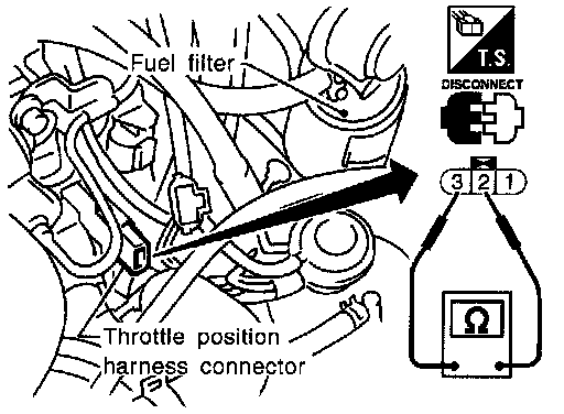 4. Make sure that resistance between terminals (2) and (3) changes when opening throttle valve manually.