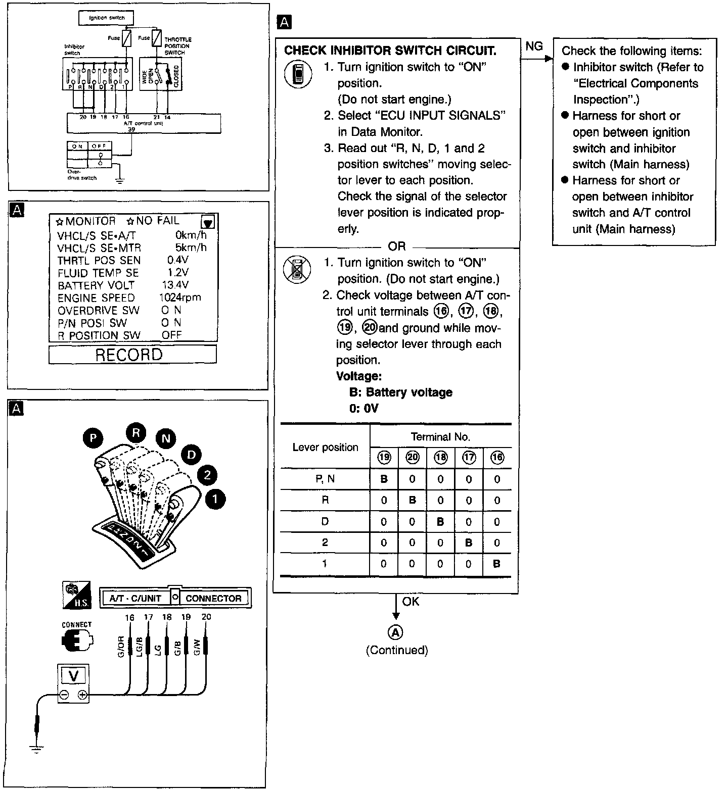 Detects the selector lever position and sends a signal to the A/T control unit.
