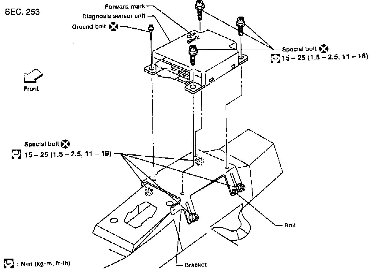CAUTION: Diagnosis sensor unit must always be installed with arrow marks "<-" pointing towards the front of the vehicle for proper operation. Also check diagnosis sensor unit for cracks, deformities or rust before installation and replace as required.