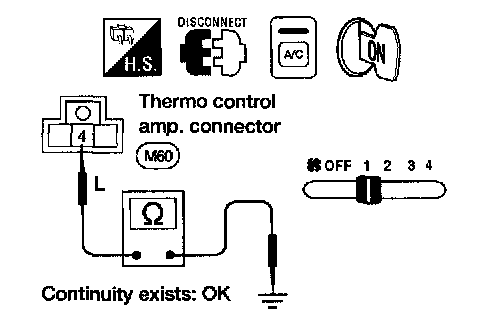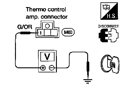 Check body ground circuit for thermo control amp. with ignition switch ON, air conditioner switch ON and fan switch ON.