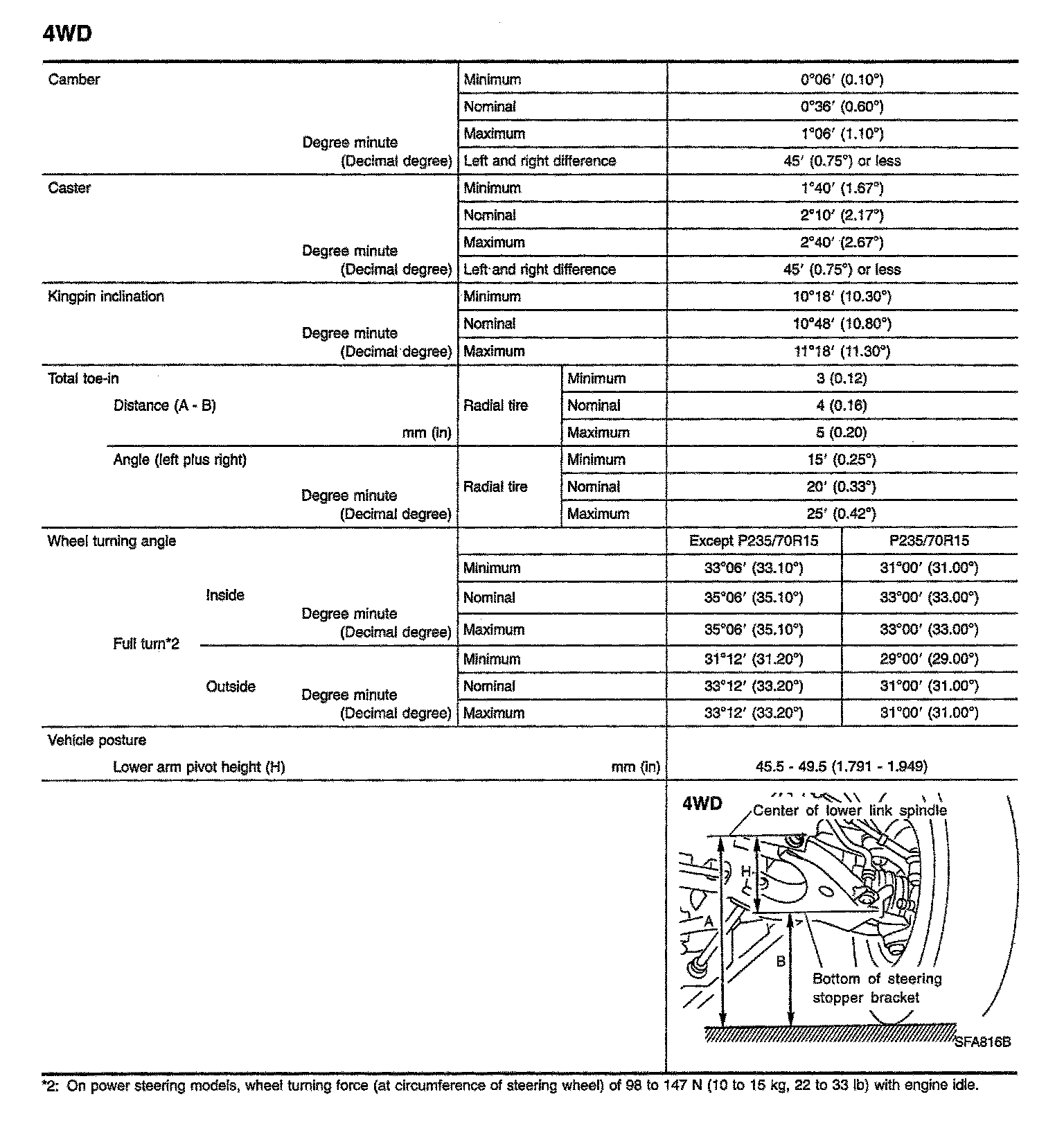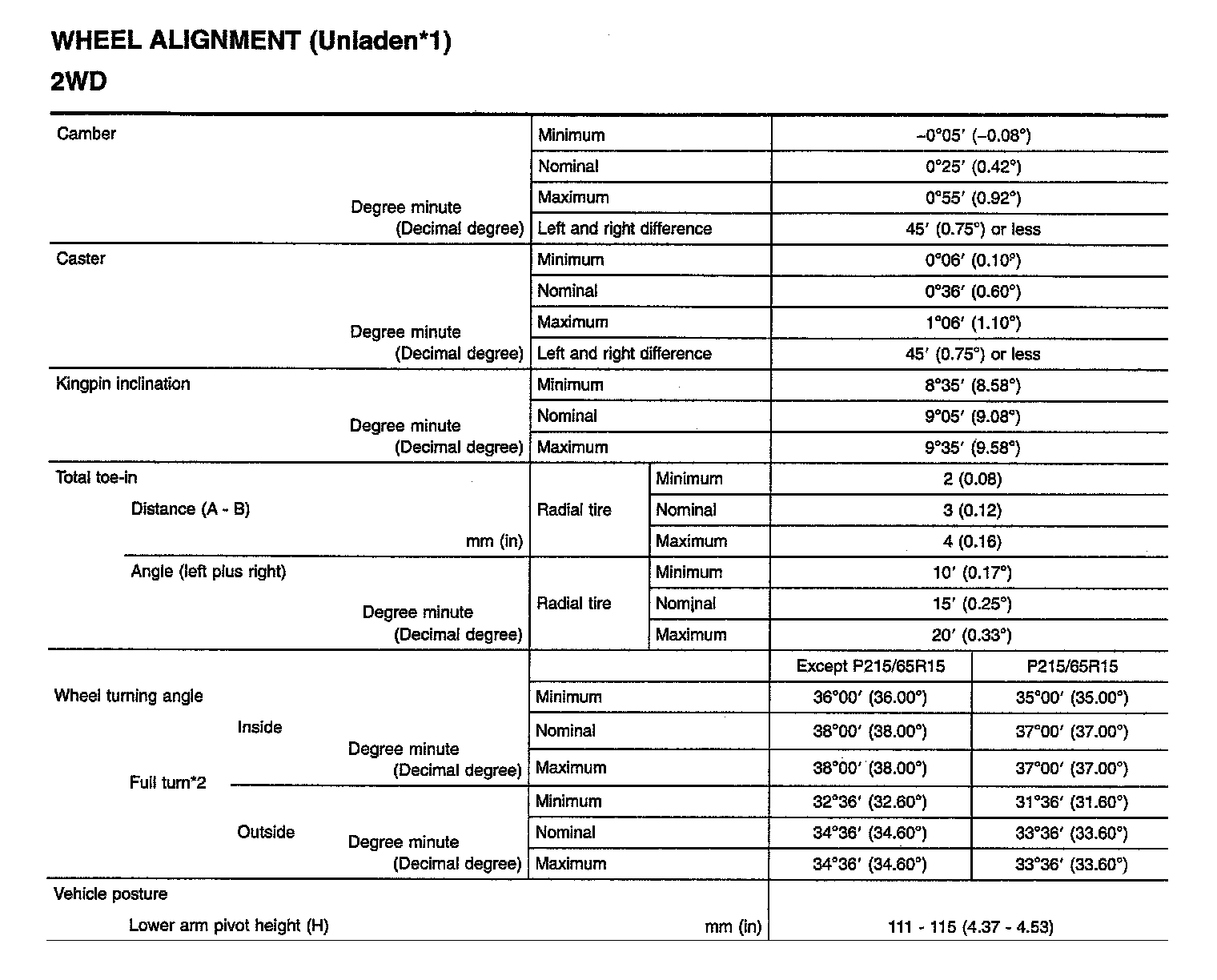 Camber, Caster, and Kingpin inclination: Refer to Specification Table.