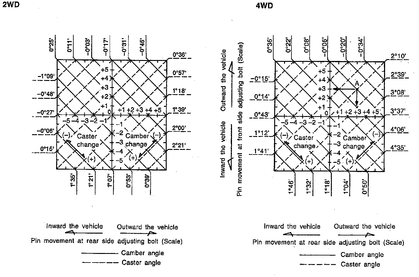 1. Both camber and caster angles are adjusted by adjusting bolts.