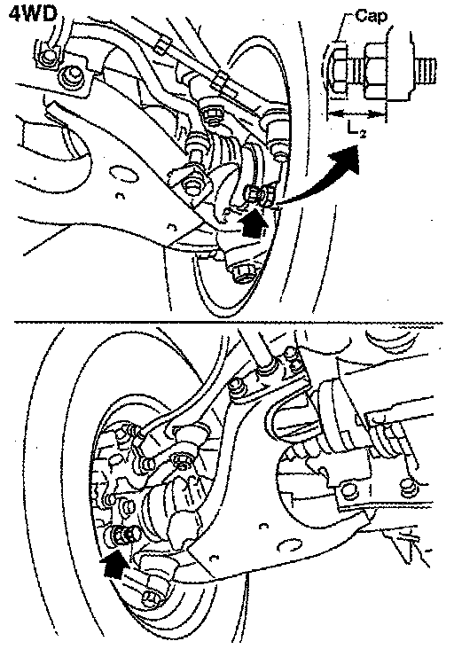 - If matching marks were already painted during suspension disassembly, align the matching marks with the slits, then temporarily tighten the adjusting bolts. Measure the camber, caster and kingpin inclination.