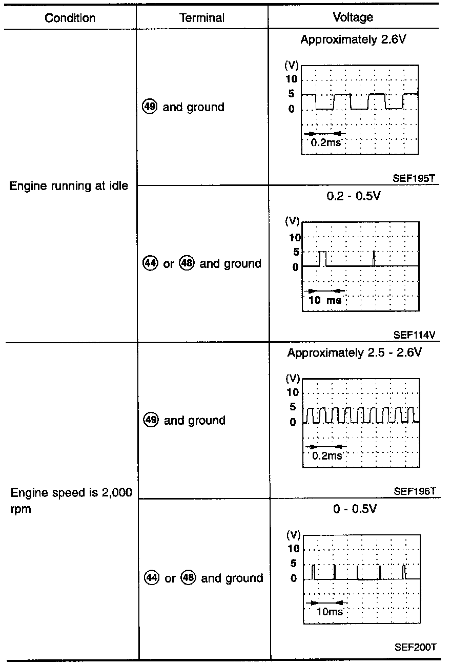 2. Check voltage between ECM terminal (49) and ground, ECM terminal (44) or (48) and ground.
