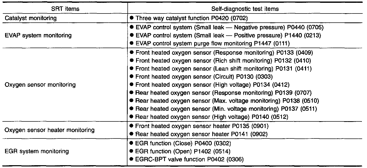 SRT codes are set after self-diagnosis has been performed one or more times. This occurs regardless of whether the diagnosis is in "OK" or "NG", and whether or not the diagnosis is performed in consecutive trips. The following table lists the five SRT items (18 test items) for the ECCS used in D22 models.