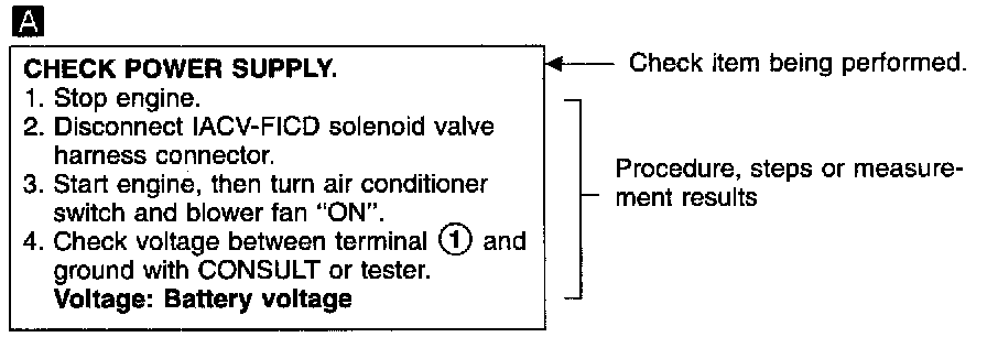 Illustrations are provided as visual aids for work procedures. For example, symbol [A] indicated in the left upper portion of each illustration corresponds with the symbol in the flowchart for easy identification. More precisely, the procedure under the "CHECK POWER SUPPLY" outlined previously is indicated by an illustration [A]