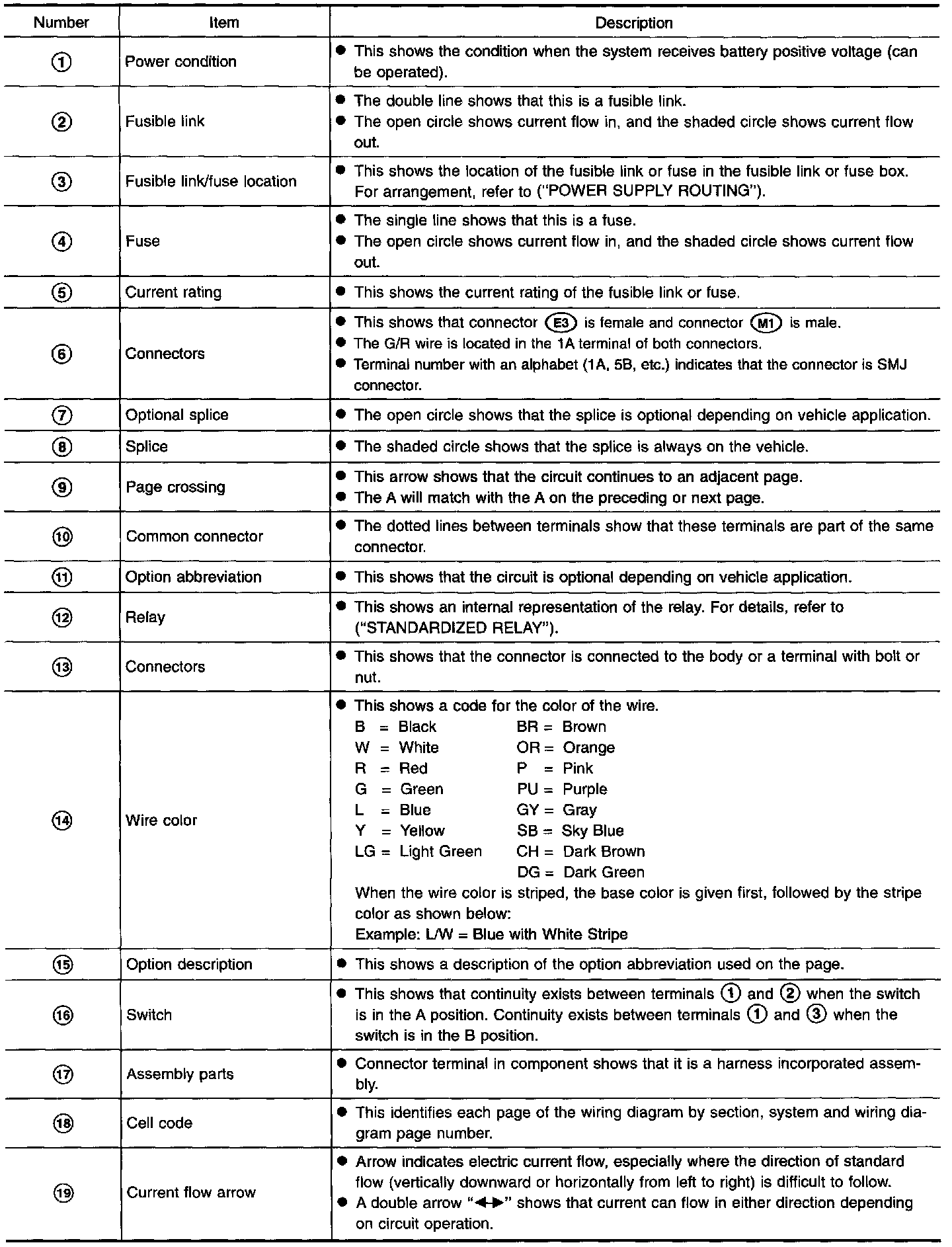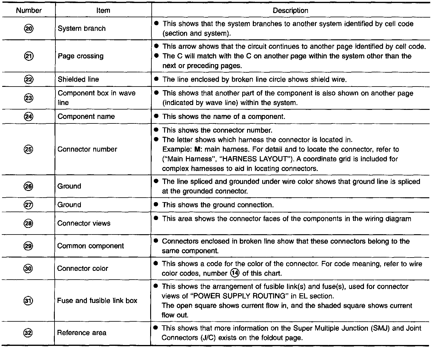 ^ Connector symbols shown from the harness side are enclosed by a double line and followed by the direction mark.