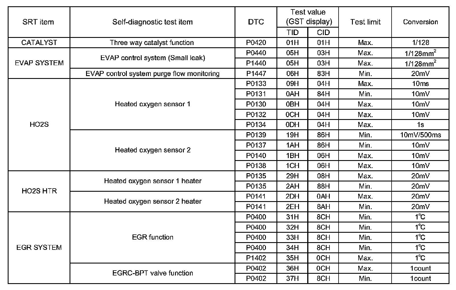 The test value is a parameter used to determine whether a system/circuit diagnostic test is "OK" or "NG" while being monitored by the ECM during self-diagnosis. The test limit is a reference value which is specified as the maximum or minimum value and is compared with the test value being monitored. Items for which these data (test value and test limit) are displayed are the same as SRT code items (9 test items).