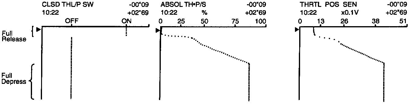 The following are the major sensor reference graphs in "DATA MONITOR" mode. (Select "HI SPEED" in "DATA MONITOR" with CONSULT)THRTL POS SEN, ABSOL TH.P/S, CLSD THL/P SW