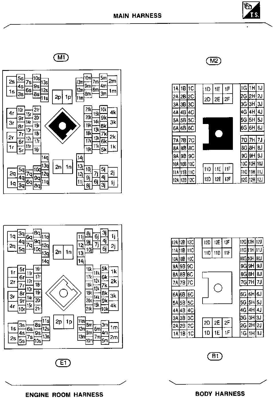 E1, M1 Body, Engine and Main Harness Terminal Arrangements