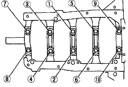 - Tighten bearing cap bolts gradually in two or three stages. Start with center bearing and move outward as shown in figure.