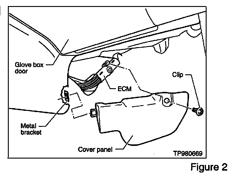 1. Check for moisture and/or mildew on the passenger side carpeting around the ECM area and check the ECM for signs of water damage (see Figure 2 for ECM location).