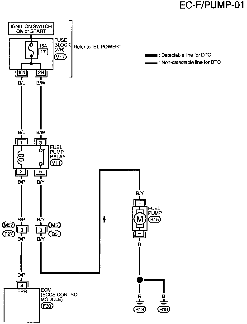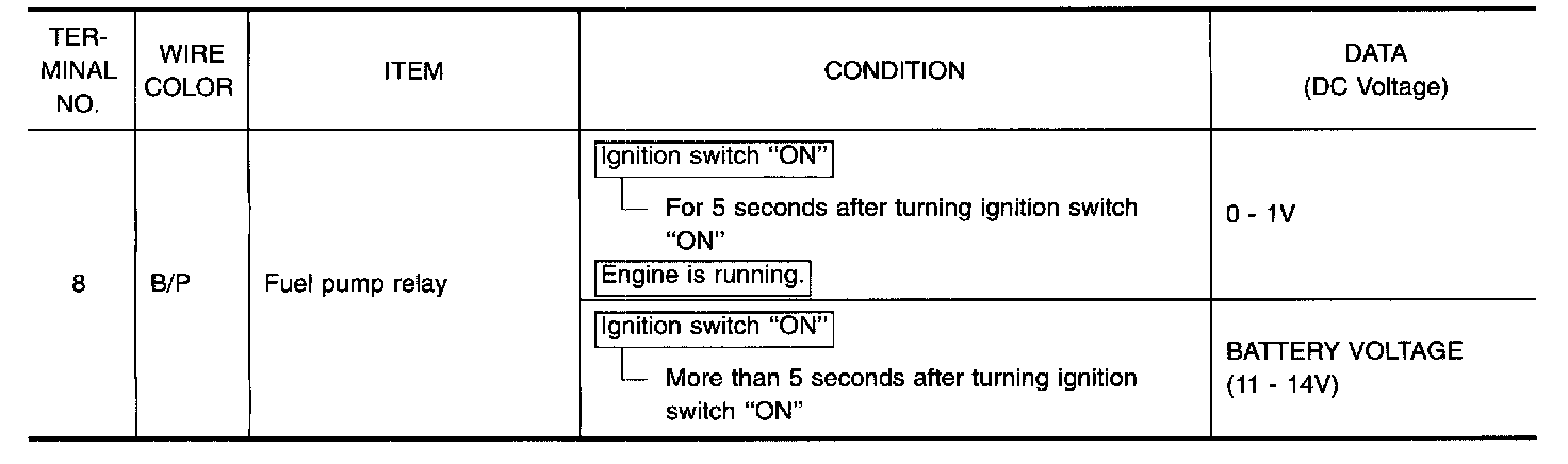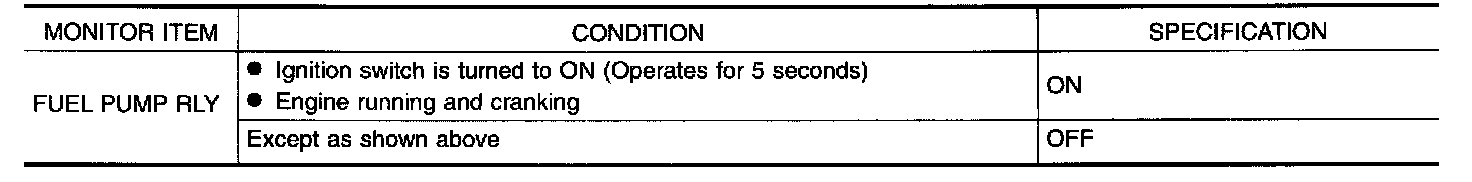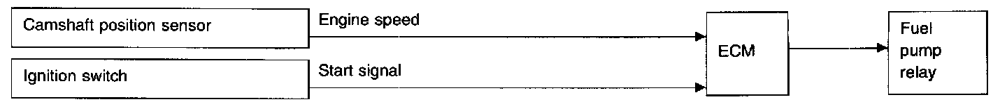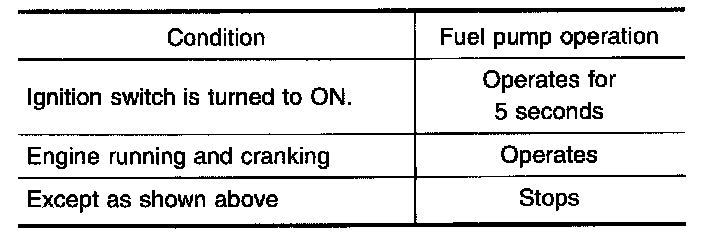 The ECM activates the fuel pump for several seconds after the ignition switch is turned on to improve engine startability. If the ECM receives a 180 ° signal from the camshaft position sensor, it knows that the engine is rotating, and causes the pump to perform. If the 180 ° signal is not received when the ignition switch is on, the engine stalls. The ECM stops pump operation and prevents battery discharging, thereby improving safety. The ECM does not directly drive the fuel pump. It controls the ON/OFF fuel pump relay, which in turn controls the fuel pump.