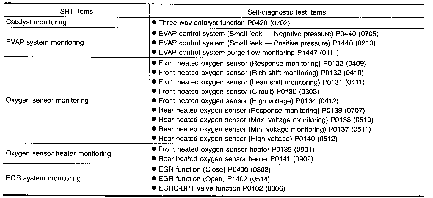 SRT codes are set after self-diagnosis has beer performed one or more times. This occurs regardless of whether the diagnosis is in "OK" or "NG", and whether or not the diagnosis is performed in consecutive trips. The following table lists the five SRT items (18 test items) for the ECM used in L30 models.