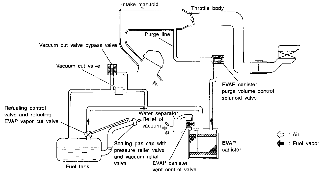 The vapor in the EVAP canister is purged by the air through the purge line to the intake manifold when the engine is operating. EVAP canister purge volume control solenoid valve is controlled by engine control module. When the engine operates, the flow rate of vapor controlled by EVAP canister purge volume control solenoid valve is proportionally regulated as the air flow increases.