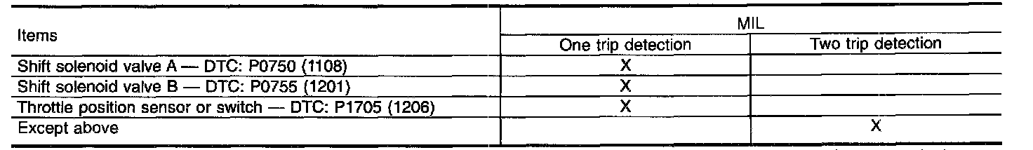 A/T-related parts for which the MIL illuminates during the first or second test drive are listed in the table.