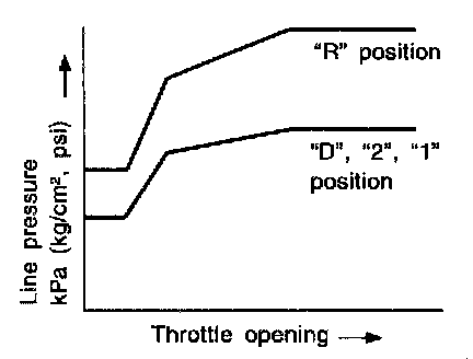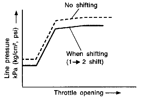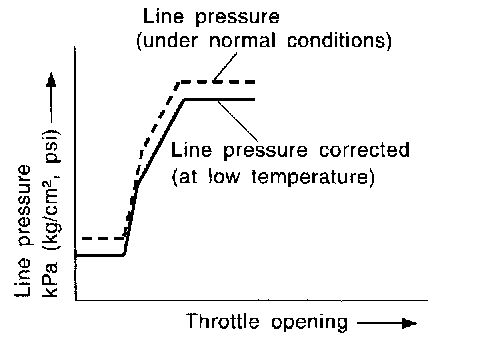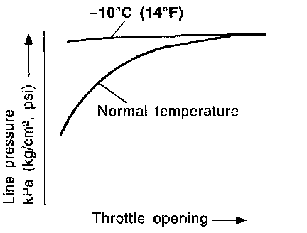 - Line pressure is increased to a maximum irrespective of the throttle opening when fluid temperature drops to -10 °C (14 °F). This pressure rise is adopted to prevent a delay in clutch and brake operation due to extreme drop of fluid viscosity at low temperature.