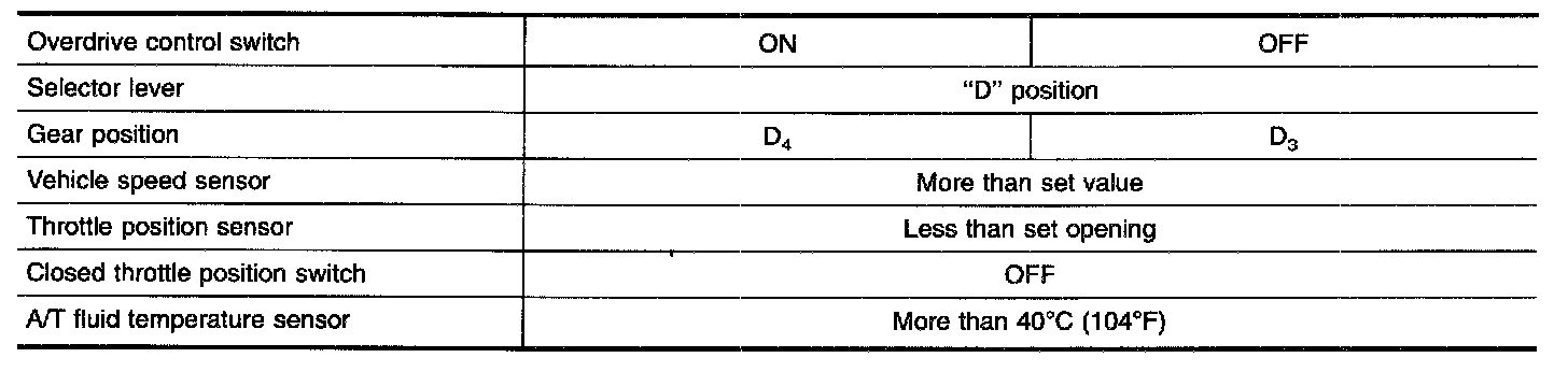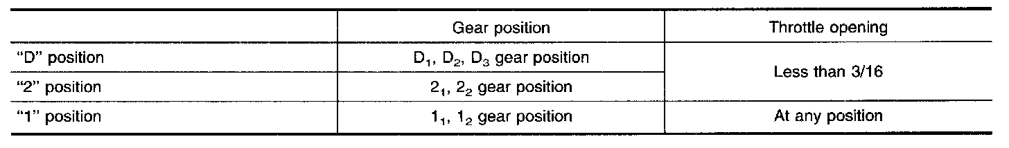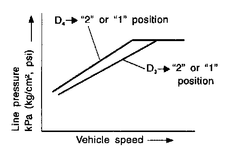 If the selector lever is shifted to "2" position while driving in D(4) (OD) or D(3), great driving force is applied to the clutch inside the transmission. Clutch operating pressure (line pressure) must be increased to deal with this driving force.