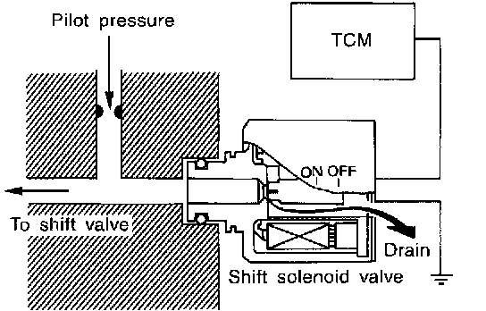 The shift solenoid valve performs simple ON-OFF operation. When set to ON, the drain circuit closes and pilot pressure is applied to the shift valve.