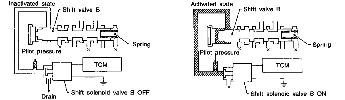 The drawing above shows the operation of shift valve B. When the shift solenoid valve is ON, pilot pressure applied to the end face of the shift valve overcomes spring force, moving the valve upward.