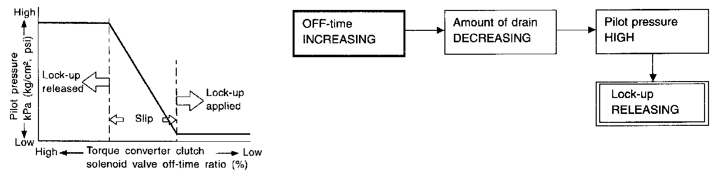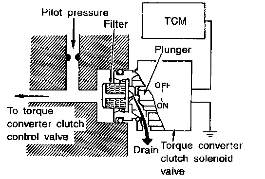 The torque converter clutch solenoid valve is controlled by the TCM. The plunger closes the drain circuit during the OFF period, and opens the circuit during the ON period. If the percentage of OFF-time increases in one cycle, the pilot pressure drain time is reduced and pilot pressure remains high.