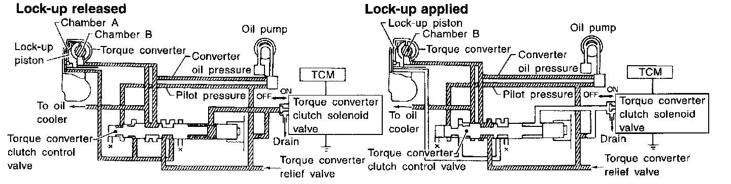 When the OFF-duration of the torque converter clutch solenoid valve is short, pilot pressure drains and becomes low. Accordingly, the control valve moves to the right by the pilot pressure of the other circuit and converter pressure. As a result, converter pressure is applied to chamber B, keeping the lock-up piston applied.