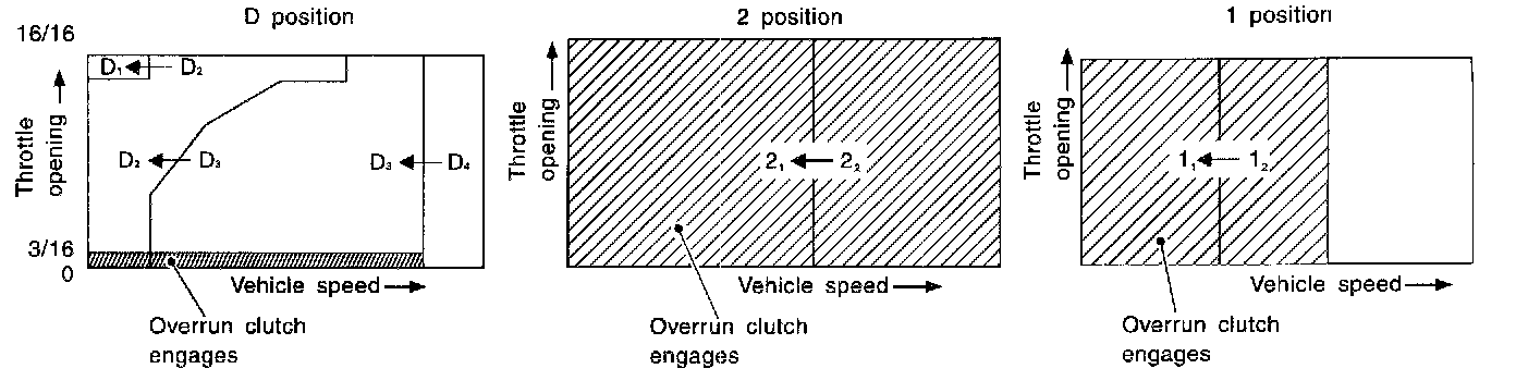 The shift is regulated entirely by electronic control to accommodate vehicle speed and varying engine operations. This is accomplished by electrical signals transmitted by the revolution sensor and throttle position sensor. This results in improved acceleration performance and fuel economy.