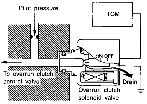 The overrun clutch solenoid valve is operated by an ON-OFF signal transmitted by the TCM to provide overrun clutch control (engine brake control).