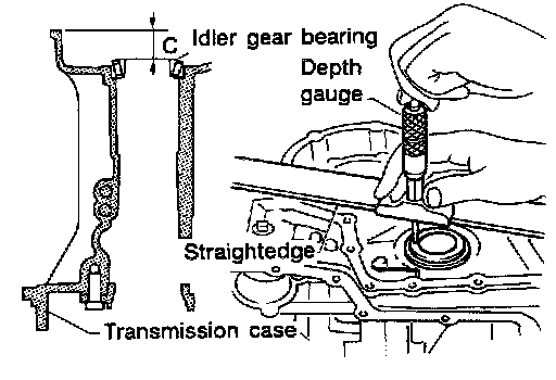 - Measure dimension "C" between the surface of idler gear bearing inner race and the surface of transmission case.