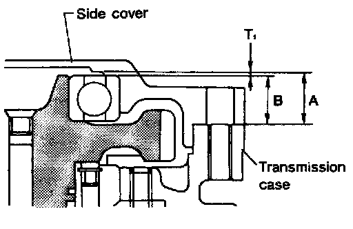 "B": Distance between the end of output shaft bearing outer race and the side cover fitting surface of transmission case.