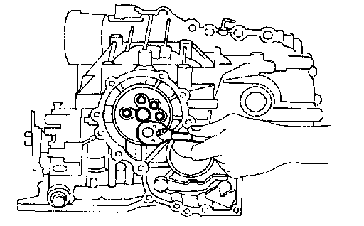 - Press idler gear until idler gear fully contacts adjusting shim.