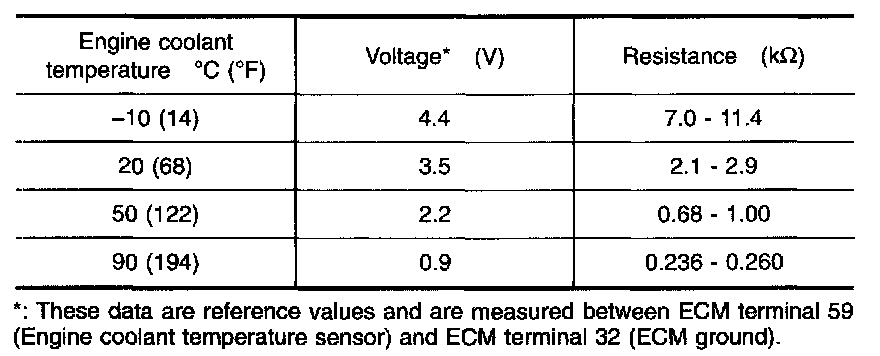 The engine coolant temperature sensor is used to detect the engine coolant temperature. The sensor modifies a voltage signal from the ECM. The modified signal returns to the ECM as the engine coolant temperature input. The sensor uses a thermistor which is sensitive to the change in temperature. The electrical resistance of the thermistor decreases as temperature increases.