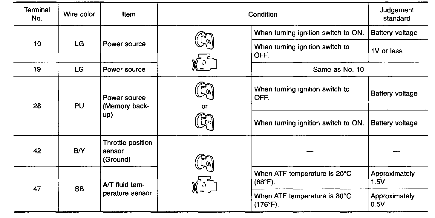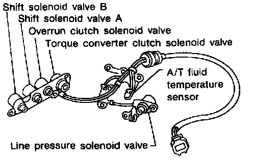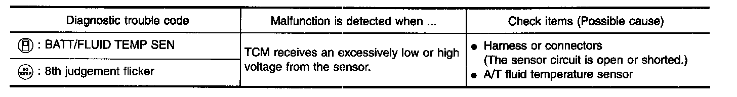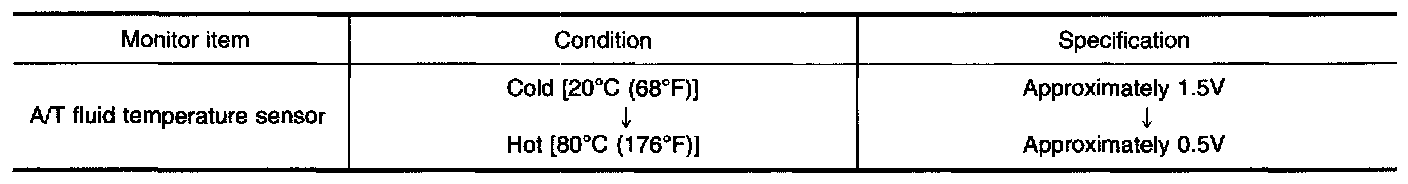 The A/T fluid temperature sensor detects the A/T fluid temperature and sends a signal to the TCM.