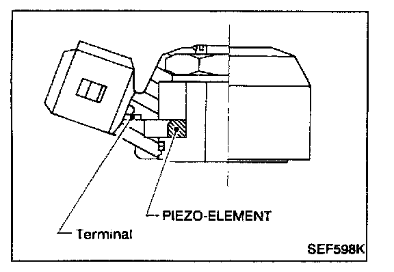 The knock sensor is attached to the cylinder block. It senses engine knocking using a piezoelectric element. A knocking vibration from the cylinder block is sensed as vibrational pressure. This pressure is converted into a voltage signal and sent to the ECM.