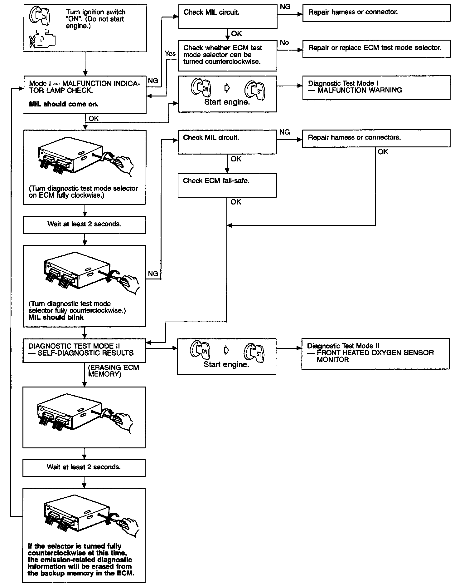 - When ignition switch is turned off during diagnosis, power to ECM will drop after approx. 5 seconds. The diagnosis will automatically return to Diagnostic Test Mode I.
