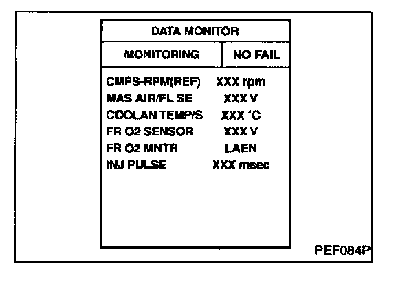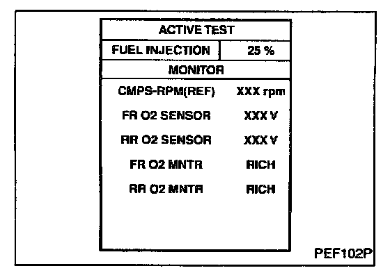 4. Check "RR O2 SENSOR" at idle speed when adjusting "FUEL INJECTION" to ± 25%.